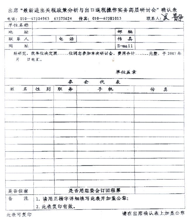出席“最新進出口稅收政策分析與操作實務高級研討會”確認表